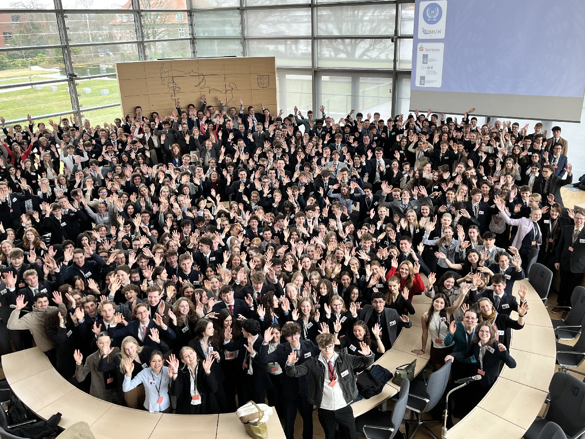 Am Donnerstag, den 12.03., sind zehn Schülerinnen und Schüler, davon vier aus Jahrgang 12 und sechs aus Jahrgang 11 in Begleitung von Herrn Lüders, aus Ringelheim in Richtung Kiel gefahren. Nach einer Zugfahrt mit ausgiebigen vorbereitenden Gesprächen und wachsender Aufregung kamen wir am Nachmittag im Hotel in der Landeshauptstadt an. Wir hatten nun etwa drei Stunden Freizeit bis dann um zwanzig Uhr die feierliche Eröffnungsveranstaltung in der Hebbelschule losging. Hier wurden wir von der diesjährigen Generalsekretärin mit einer Rede begrüßt und Model United Nations 2026 war für eröffnet erklärt. Dieses Projekt gibt jungen Menschen die Möglichkeit eine Simulation der Vereinten Nationen zu erleben und bei UN typischen Sitzungen teilzunehmen. Der folgende Tag begann früh und nach dem Frühstück fuhren wir alle, sehr schick und formal gekleidet, mit dem überfüllten Bus zum Schleswig Holsteiner Landtag. Nach der Registrierung, den ersten Einweisungen und einem Gruppenfoto verteilten wir uns auf unsere ausgewählten Gremien. Vier Leute blieben im Plenarsaal und somit im größten Gremium mit 98 Delegierten, andere gingen nun in z.B. den Wirtschafts- und Sozialrat, die Ernährungs- und Landwirtschaftsorganisation, die Umweltversammlung oder in andere UN-Gremien. Als Delegierte vertraten wir ab jetzt einen Staat und sprachen ausschließlich für unser Land, nicht mehr für uns. Dieses Jahr vertrat unsere Schule Costa Rica, Polen, Dschibuti und Vanuatu. Im weiteren Tagesverlauf fanden wir uns langsam in unser Gremium und den Ablauf einer UN-Debatte ein.