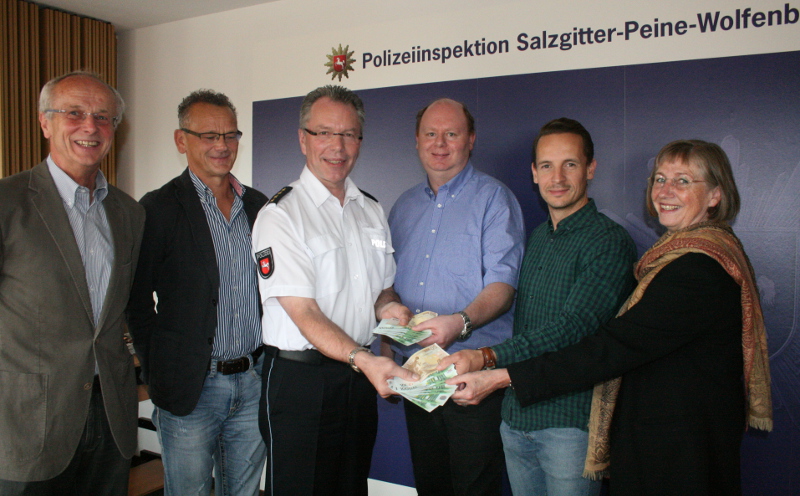 Den Erlös ihrer Skat- und Doppelkopfturniere spendete die Polizei in diesem Jahr an 2 Schulen. Während die Ludwig-Erhard-Schule eine Unterstützung für einen Besuch im Hochseilgarten im Rahmen ihres Anti-Mobbing-Konzepts erhält, geht der andere Teil an das Gymnasium Salzgitter-Bad. Hiermit soll die weitere Ausbildung der Medienscouts finanziert werden. Der Leitende Polizeidirektor der Polizeiinspektion Salzgitter-Peine-Wolfenbüttel Herr Wilfried Berg übergab in Anwesenheit der beiden Organisatoren der Spielrunden Herrn Kinat und Herr Bartels (ebenfalls Polizeiinspektion Salzgitter) jeweils 750 € an die Vertreter der Ludwig-Erhard-Schule und an Martin Gosch, der die Medienscouts in ihrer Ausbildung an unserer Schule begleitet und anleitet.